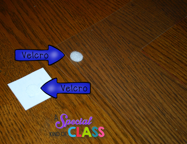 I added Velcro to each of the corners and on the back of the words. You can put Velcro wherever you need too. Some children make better choices along the top, or along the bottom, or one side or the other. Put Velcro where you need to or put Velcro along the whole square, if you are still trying out locations to determine the best spots.
